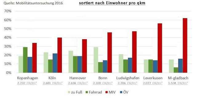Die Leverkusener Politik muss endlich begreifen, dass ihre Zentren Opladen, Wiesdorf und Schlebusch keine Oberzentren sind, sondern Vorort-Städtchen von Kölle. Der Anteil von Rad und Bus & Bahn an der Verkehrsleistung wird immer sehr viel geringer sein als in sehr dicht besiedelten Metropolen wie Kopenhagen oder Amsterdam. Leverkusen kann sich mit einer polyzentrischen Stadt wie Mönchengladbach vergleichen. Dort wird rund 65% weniger Rad gefahren als bei uns. Das steht übrigens alles in der Verkehrs-Studie "Moko 2030+". Aber so wirr durcheinander gewürfelt, dass niemand mehr was erkennt. Ich habe das mal richtig sortiert: